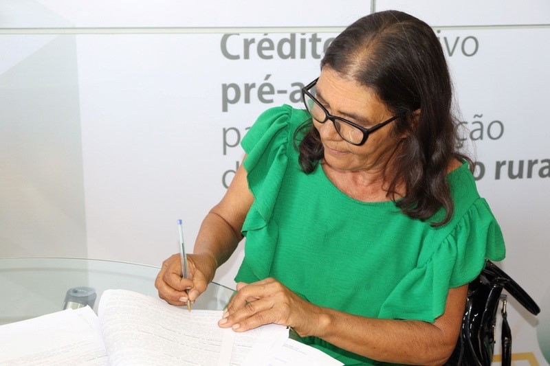 Agricultora famiilar contratou financiamento no estande do BNB na Expomontes 2024.