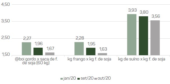 As cotações melhoraram em todos os segmentos, mas, por melhor que tenham sido esses desempenhos, a relação de troca com o milho e o farelo de soja caíram em outubro, veja nas figuras 1 e 2.