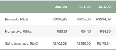 Tabela 1. Avanço nos preços médios pagos pela arroba do boi gordo (R$/@), frango (R$/kg) e suíno (R$/@)